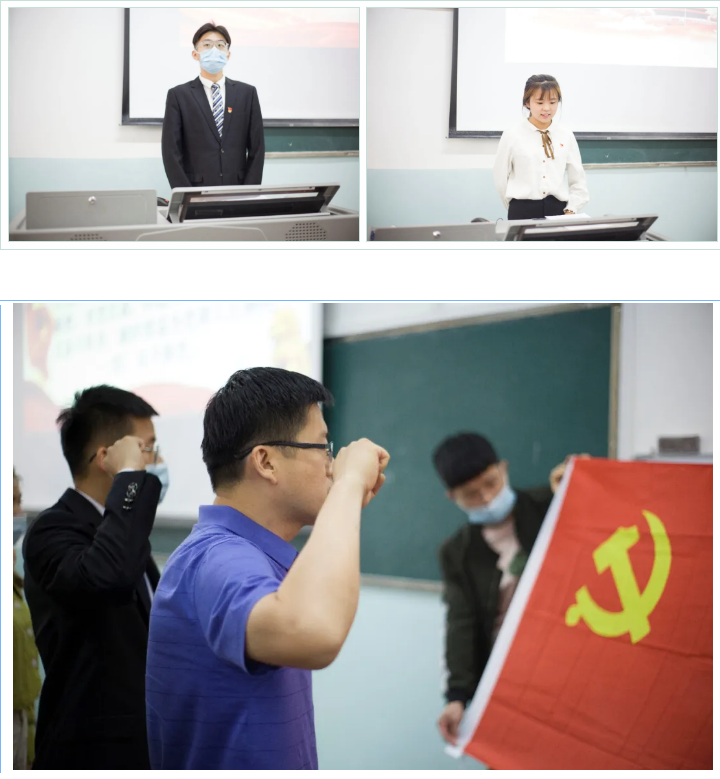 随后,组织2019年以来的新党员进行入党宣誓。在教师党员为他们佩戴党徽后,由宋宏伟带领新党员站在鲜红的党旗下,举起右拳,庄严宣誓:“我志愿加入中国共产党,拥护党的纲领,遵守党的章程……永不叛党!”此刻他们的情绪无比激动,一句句掷地有声的誓言将永远回荡在他们的心房。