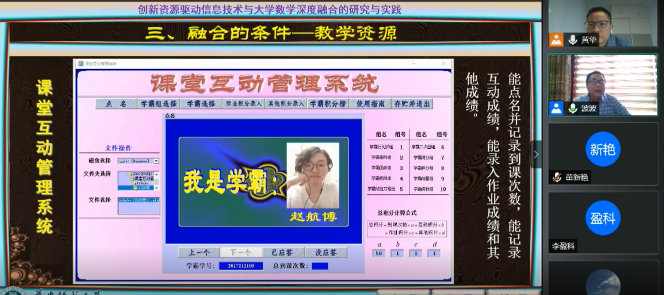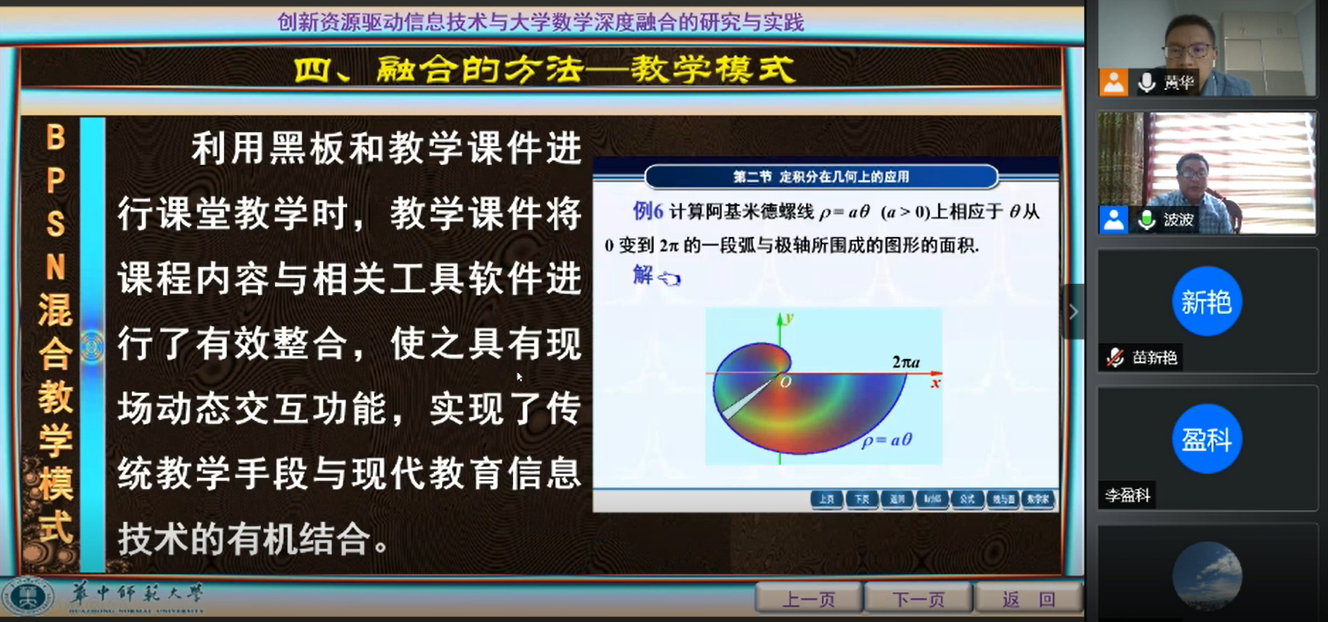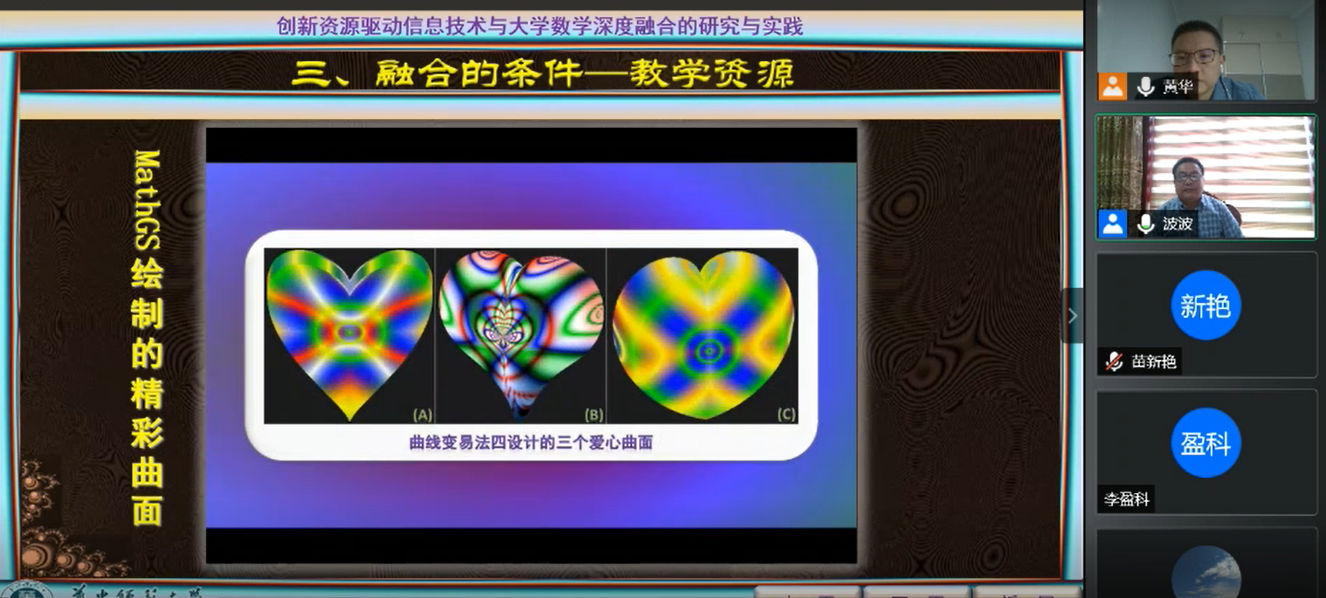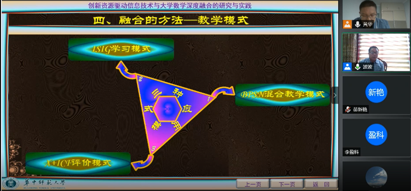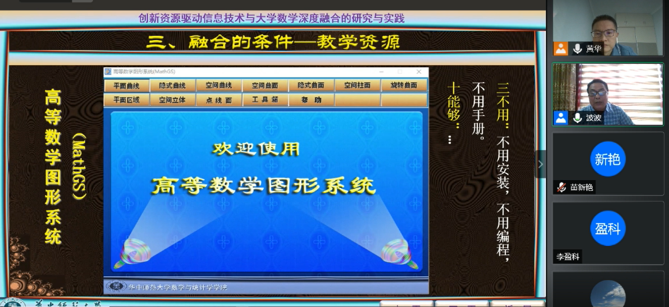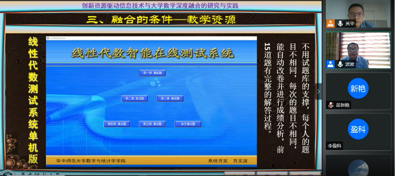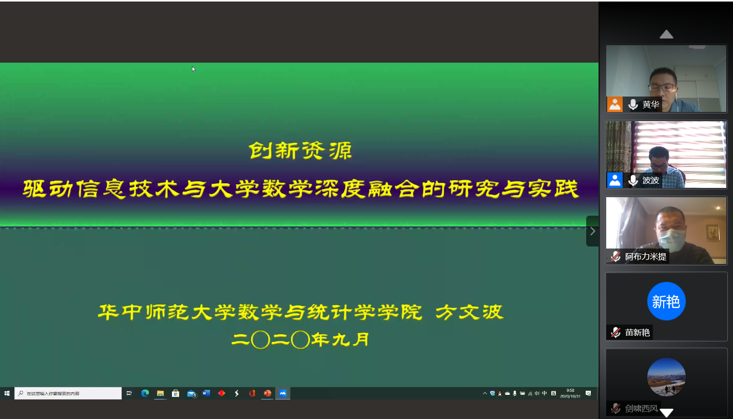 2020年10月31日上午,华中师范大学数学与统计学学院应学校教务处及百合漫画 邀请,通过线上方式,为我校教师做了题为“创新资源驱动信息技术与大学数学深度融合的研究与实践”的报告。副院长黄华主持,百合漫画 42名专任教师聆听了讲座。