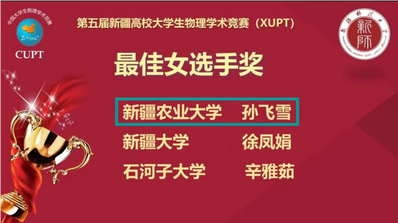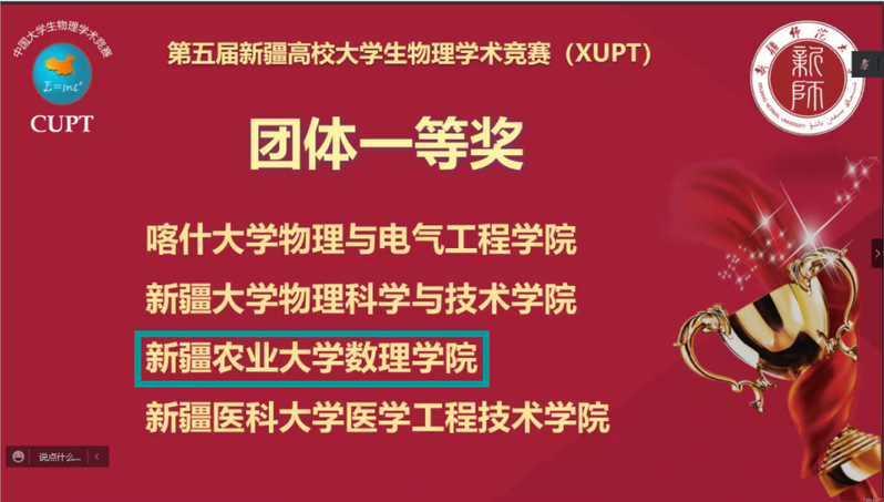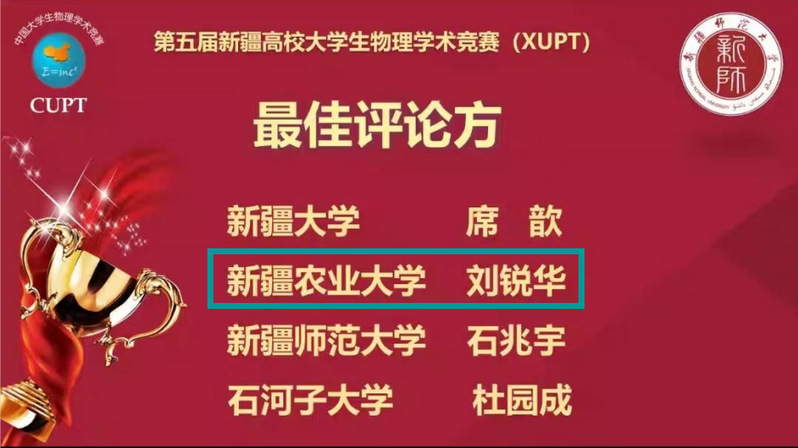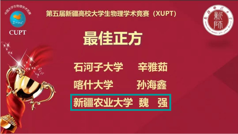 2022年5月29日,中国大学生物理学术竞赛(CUPT)新疆区赛暨2022年度第五届新疆大学生物理学术竞赛(CUPT)圆满结束。经过两天四轮总共45个阶段的对阵,由百合漫画 各学院学生组建的新农1队和新农2队以优异的成绩获得团体一等奖1项、团队二等奖2项、最佳选手奖、最佳女选手奖、最佳正方辩手奖、最佳反方辩手奖和最佳评论方奖各1项的荣誉。这是我校首次参加中国大学生物理学术竞赛(CUPT)并且取得佳绩,为我校建校70周年隆重献礼。