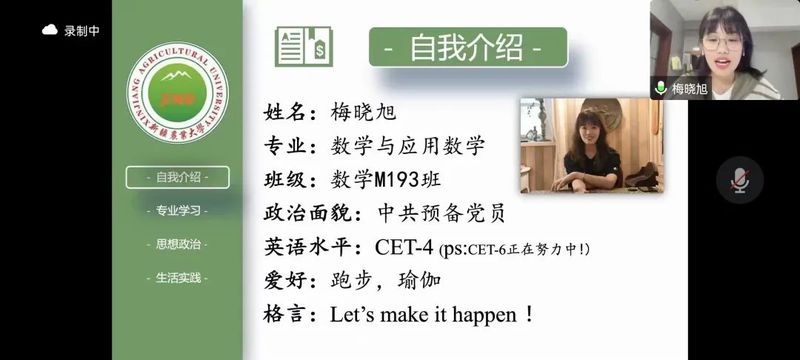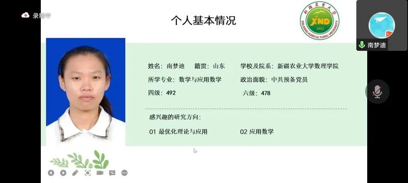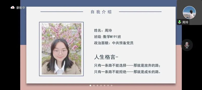 数学M193班的梅晓旭始终坚信勇往直前、梦想成真。她自信大方地向大家展示了自己在学习工作、实习业务、志愿公益等方面的优秀成绩。身为一名数理学子,她在学习成绩优异的同时,积极投身实践,不断磨砺自己的业务能力水平,用汗水勾勒出未来的蓝图。