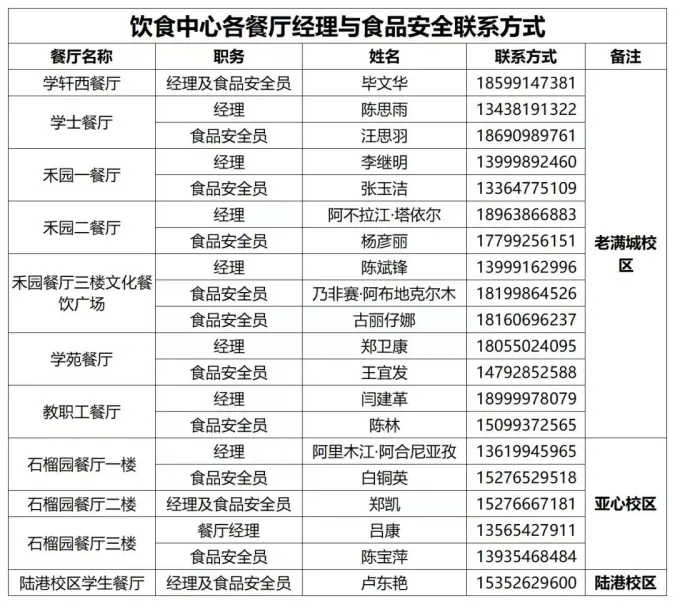 解答:权益座谈会时饮食中心主任明景磊表示各餐厅醒目处都有公示餐厅经理和食品安全员的电话,并提供了投诉渠道,希望同学们出现问题直接找餐厅经理或食品安全员当场解决,也可以到饮食中心进行投诉,出现的所有问题都将会积极解决。