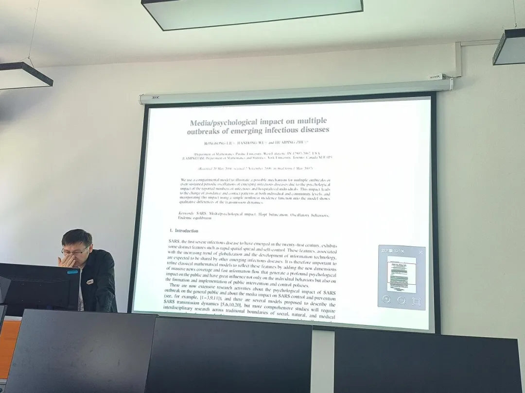 生物数学团队努尔别克老师讲座的题目是讲座的题目是《Media psychological impact on multiple outbreaks of emerging infectious diseases》。在本文中,使用一个隔室模型来说明由于报告的感染者和住院者数量的心理影响,新发传染病可能多次爆发甚至持续周期性振荡的可能机制。这种影响导致个人和社区层面的回避和接触模式发生变化,并将这种影响通过一个简单的非线性发生率函数纳入模型,显示出传播动力学的定性差异。