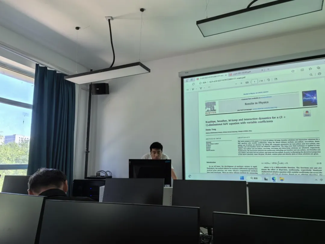 生物数学团队张宁老师讲解了两篇文献,《N-soliton, breather, M-lump and interaction dynamics for a (2+1)-dimensional KdV equation with variable coefficients》以及《Multiwave interaction solutions for a (3+1)-dimensional generalized Kadomtsev-Petviashvili equation》