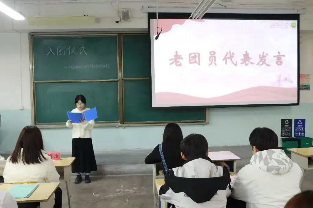 随后,老团员代表黄紫橙同学发言。黄紫橙同学深情回顾了自己的入团经历,分享了作为团员应有的责任与使命。她号召新团员要以更高的标准来要求自己,不仅要继承前辈们的优良传统,更要勇于创新、敢于担当,为团组织注入新的动力和活力。